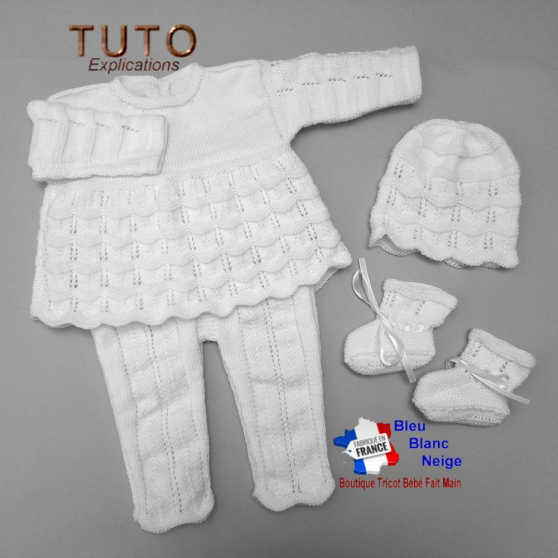 Patron à tricoter de cet ensemble tricot bébé BRASSIÈRE, PANTALON, BONNET, CHAUSSONS à motifs 'CRANS'. Explications de ce modèle layette que vous pourrez recevoir en PDF par email en vous rendant sur ma boutique bleublancneige - tapez bleublancneige dans la barre de recherche - Explications détaillées avec beaucoup d'illustrations photos pour une meilleure compréhension de la fiche tricot - Tutoriel tricot bébé, modèle layette bébé de mes propres créations, tricotées avec des laines spéciales bébé, mais vous pouvez choisir la laine que vous souhaitez si vous respectez le numéro d'aiguille. Chaque pièce que je crée est le fruit d'un travail minutieux, où chaque détail est pensé pour offrir chaleur et confort aux nouveau-nés.
